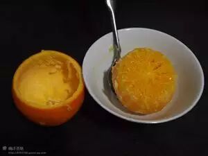 勺子在橙皮和橙肉之间越来越深入,没多久整个橙子都被挖下来了。最底下的点点那里的经络很不好弄断,橙盅难免被弄破。