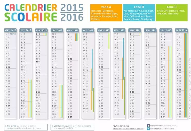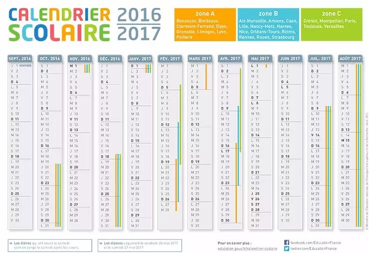 注意:在法国放假时间分为A、B、C 三个区域,每个区域的放假时间略有不同!