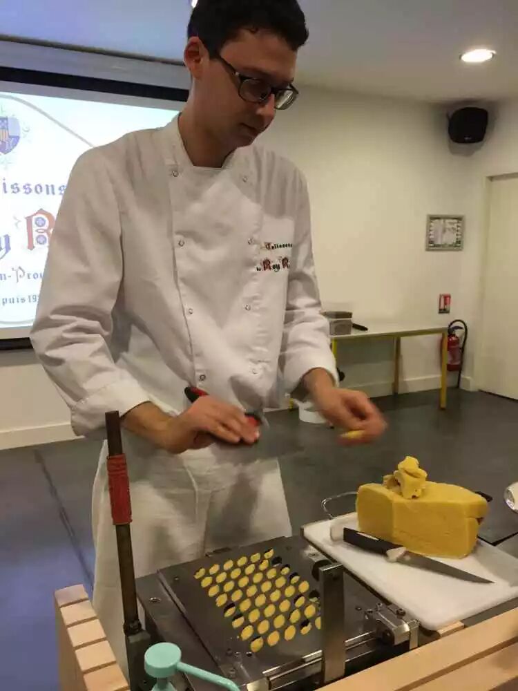 (这是用细磨的杏仁,普罗旺斯甜瓜和橘皮共同用精细的手工艺混合,之后放在薄酥饼上再铺满一层皇室糖霜。)
