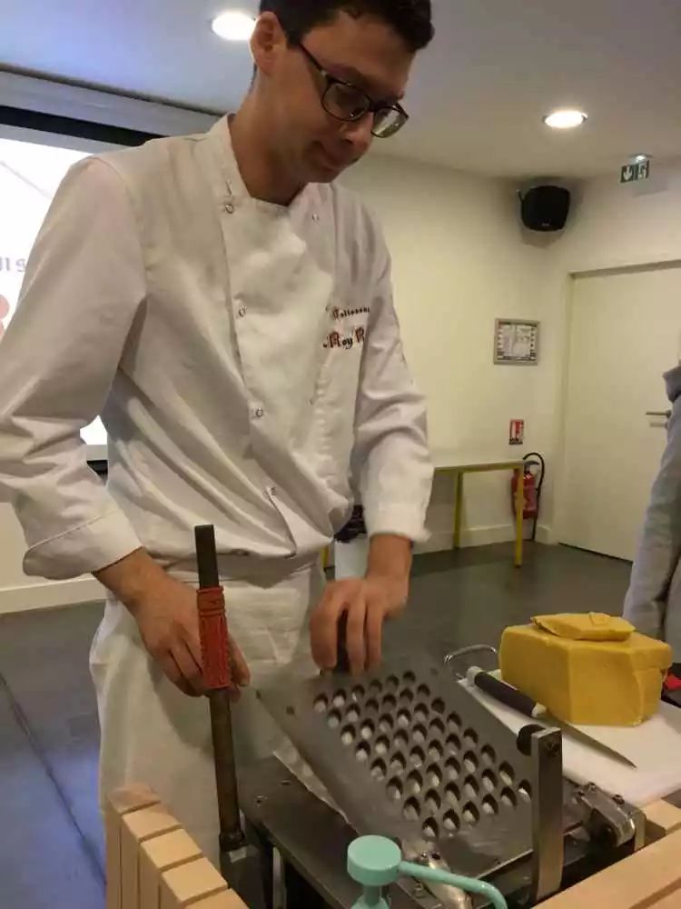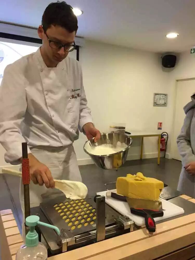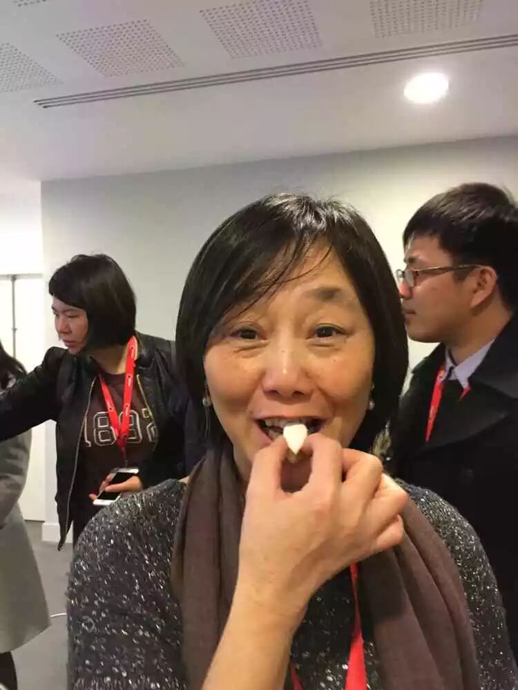 (法国点心师很会表演啊!他把这种可以吃的“纸”,专门请在座的各位,撕下来吃了。我想,这和我们中国的一种包糖的可以吃的薄薄的“米纸”,应该是一个原理吧?)