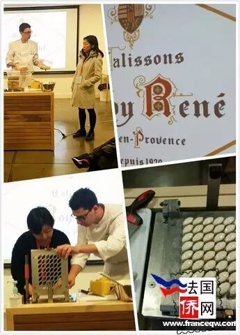 因为这里的笑脸酥Calissons是由本地产的杏仁等组成 。制作笑脸酥的杏仁有两种:脱皮的和不脱皮的;要用两种水果:橙子和甜瓜干。(然后,师傅带我们专门看了如何采摘制作杏仁的电视片,并且戴上手套,现场给我们每人品尝这个绝对没有污染的杏仁。)
