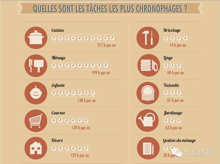 做饭,打扫屋子,带孩子,洗衣服,采购,修修补补,园艺,天下家务一般多。如果按小时来计算法国人做家务的时间,一天平均就有3个小时,一周则是21.5h,一个月就有93h,一年则有接近47天都在做家务。