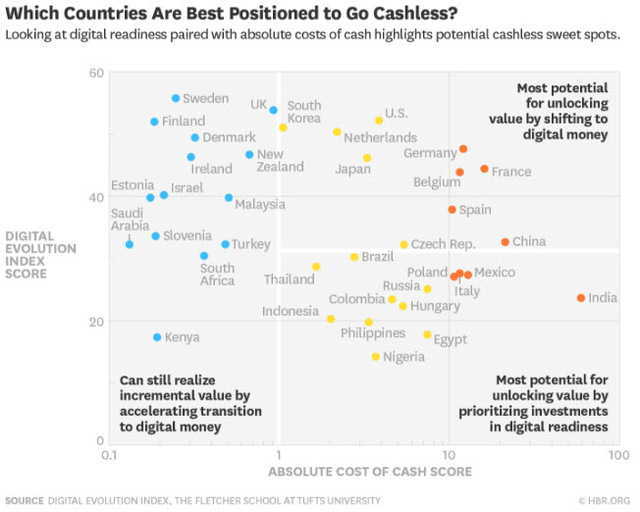 哈佛大学在下面这张图中,更加清楚的展示了世界各地无现金社会发展的程度。其中显示,瑞典、英国、芬兰等地无现金程度最高,而印度、菲律宾以及埃及等地则相对较低。