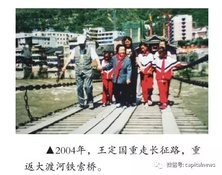 2004年,王定国重走长征路。在四川省天全县红军烈士陵园,儿女雇了顶滑竿要抬她上山,她坚定地大声说:“我是红军,我自己能上去!”在大渡河边,面对湍急的河水和摇晃的铁索桥,王定国推开上前搀扶的人,只身在一百多米的桥上走了个来回。