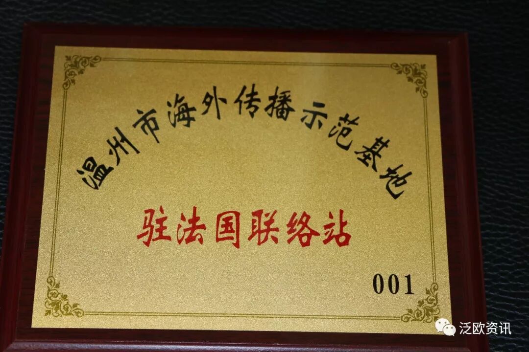 001号“温州海外传播示范基地驻法国联络站”铜牌高高挂在了法国华侨华人会!