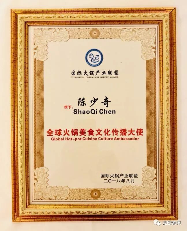 陈少奇系“国际火锅产业联盟”海外名誉主席