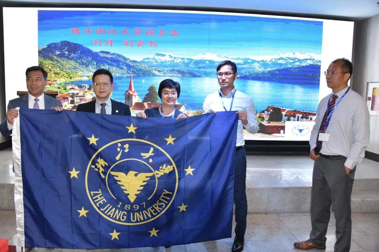 在大赛结束之后,还举行了下届会议交接会旗仪式,由浙江大学西班牙校友会会长陈军将会旗郑重交到了浙江大学瑞士校友会会长刘丹手中。